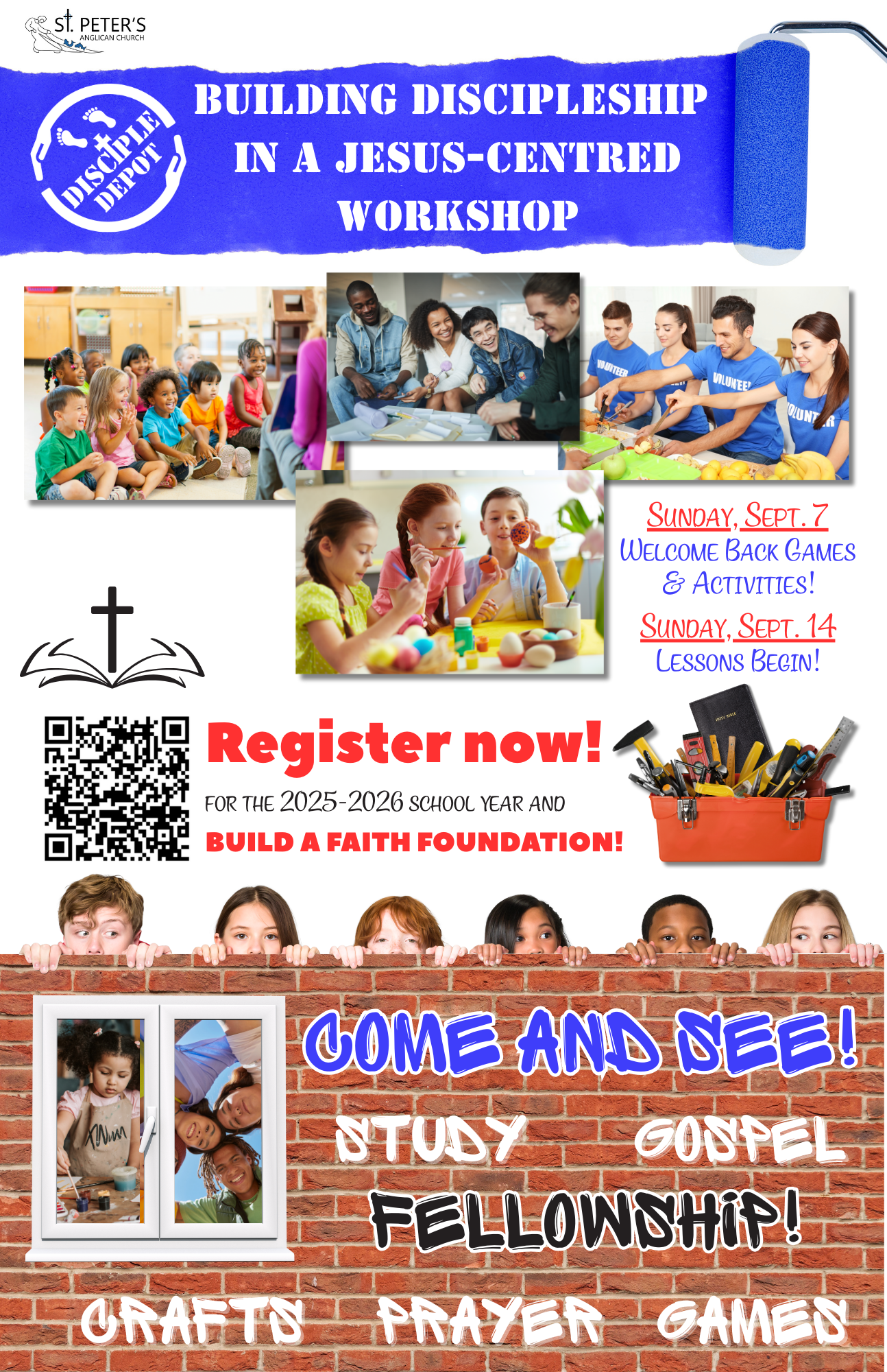 Here at St. Peter's, our Disciple Depot ministry (AKA Sunday school) is designed to build children and youth into loving, kind, caring, Jesus-centred followers, and classes officially begin Sunday, Sept. 14, during our 10 AM Holy Eucharist Service. But first, on Sept. 7, we'll have games and activities in our Lower Hall for children Age 2 to Grade 6. (St. Peter's will host its annual Welcome Back Barbecue in the courtyard on Sept. 7, following the service, so please plan on attending!)